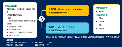 达尔西利(Dalpiciclib)是九游会医药自主研发的口服、选择性的小分子CDK4/6抑制剂,也是中国首个自主研发的新型高选择性 CDK4/6 抑制剂,已证实其与内分泌治疗(ET)联合用于 HR+/HER2- 晚期乳腺癌的一线和后线治疗时,均显著改善无进展生存期(PFS)6,7。因此开展了一项随机、双盲、III期临床试验(DAWNA-A),以进一步评估达尔西利联合内分泌治疗作为高危早期 HR+/HER2 - 乳腺癌辅助治疗的效果。本研究纳入高危复发风险人群需满足以下标准之一:①≥4 枚阳性腋窝淋巴结;②1–3枚阳性腋窝淋巴结且合并≥1 项高危因素(肿瘤直径 ≥5 cm,组织学分级3级,辅助治疗后残留浸润性乳腺癌,Ki-67 ≥30%)。本文呈现预先设定的首次中期分析(IA1)结果。